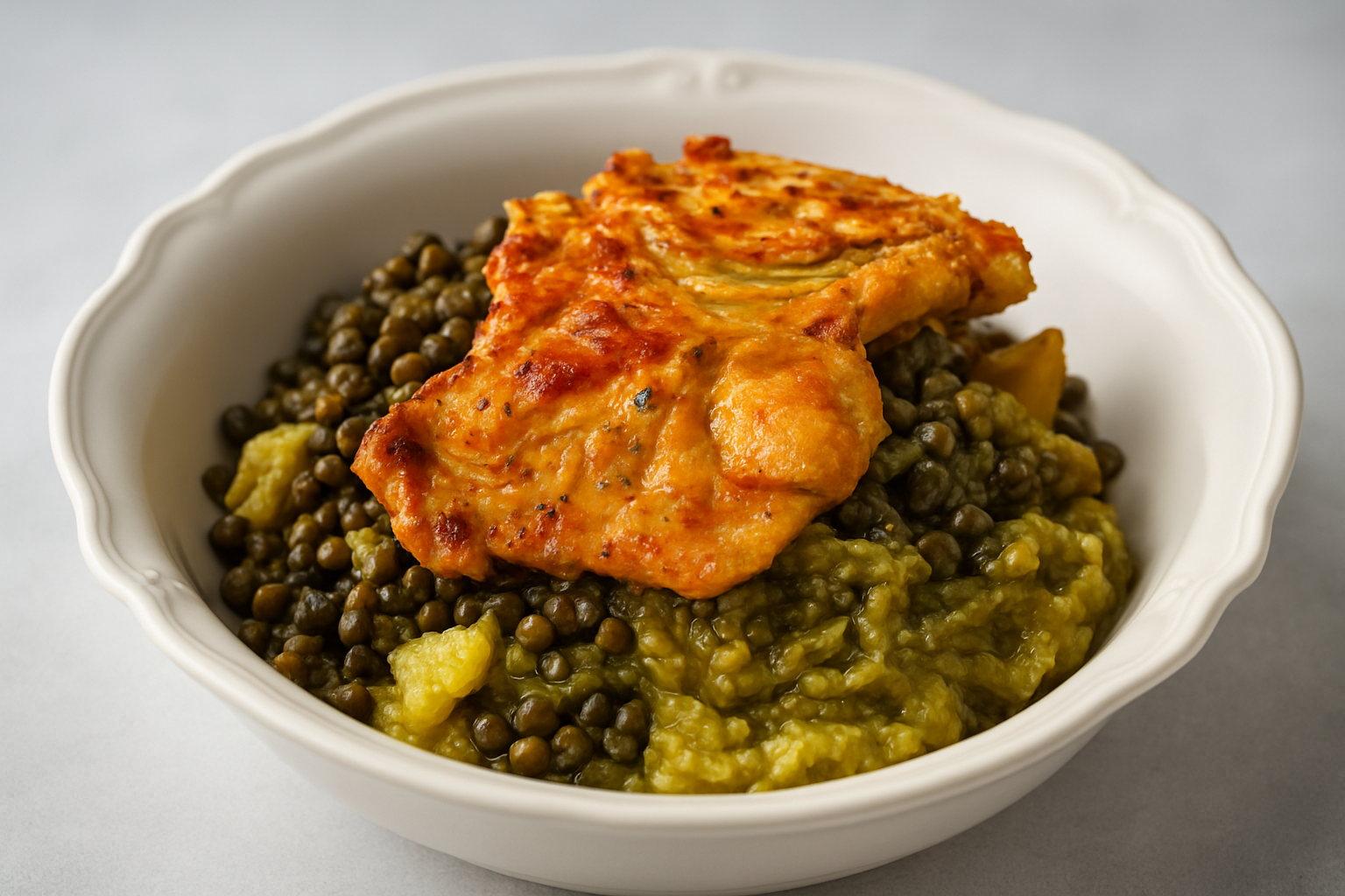 פילה פרגית על תבשיל עדשים וירקות שורש, חציל קלוי וטחינה של בני סיידא – עם שדרוג קל